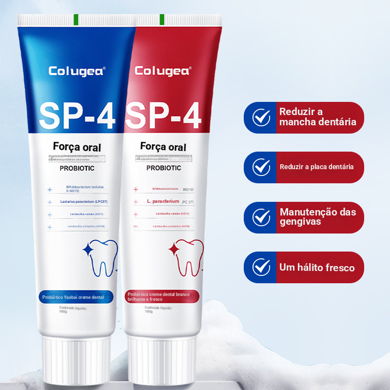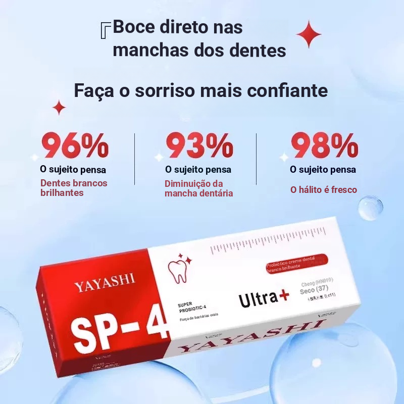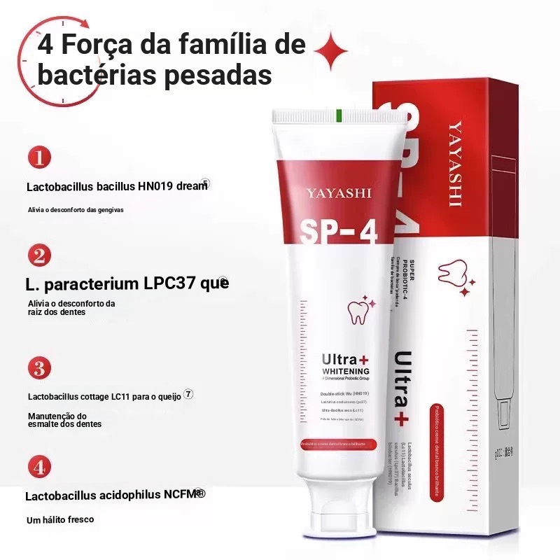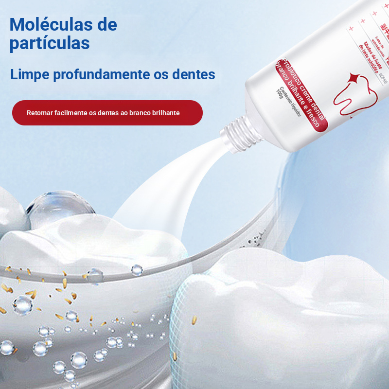 Pasta de dentes probiótica branqueadora com aroma de jasmim. Reduz o amarelecimento e elimina o mau hálito para homens e mulheres. Clareia e remove manchas. Refresca as gengivas e os dentes.